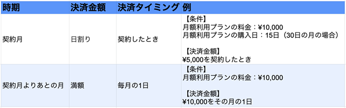 A 契約した月は日割り計算になります。例えば月額利用プランが10,000円の場合、16日に契約すると5,000円です。契約した日にクレカ決済されます。