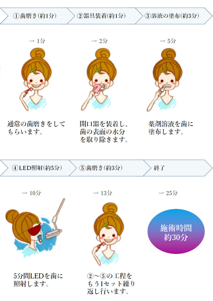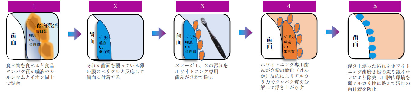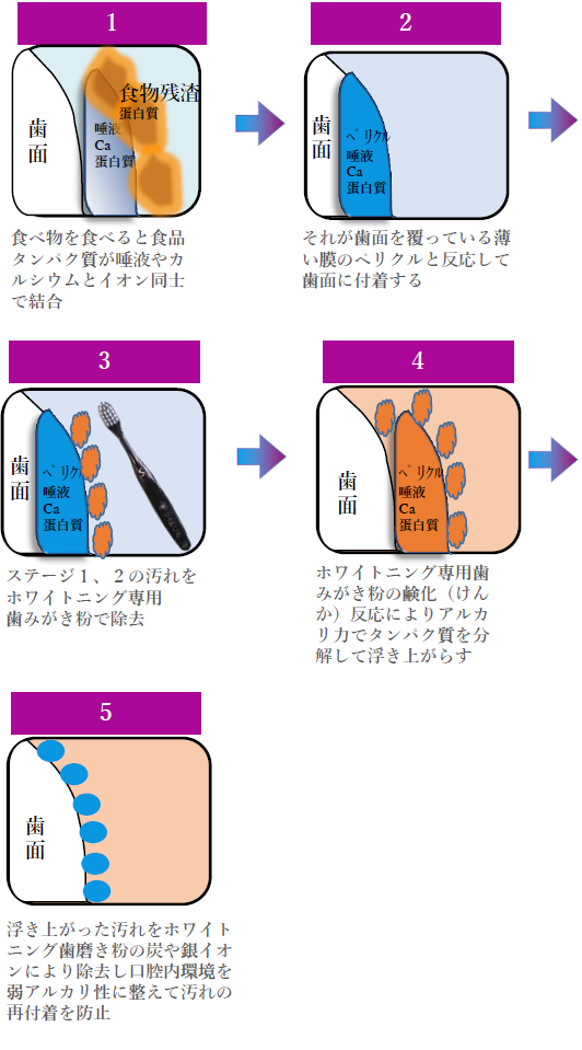 上記の1~5、A~Eの流れで汚れを分解、抗菌、殺菌、口臭予防、コーティングし健康で白い歯を実現させます。